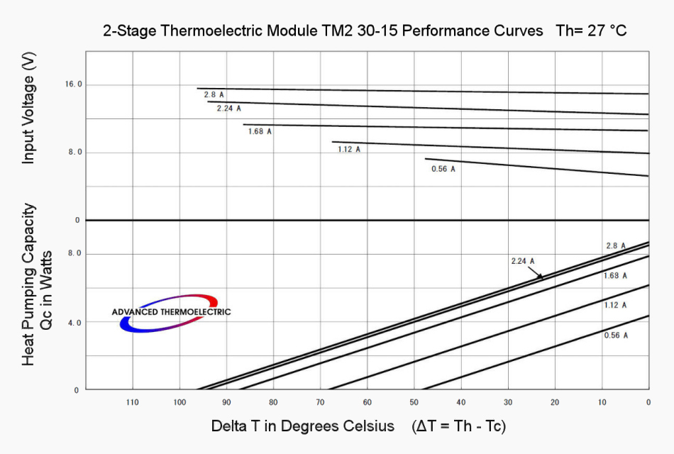 Curves with Th = 27 °C indicate what to expect operating in ambient temperatures around 20 °C (70 °F) with an operational "hot-side" temperature or Th about 7 °C above ambient.
