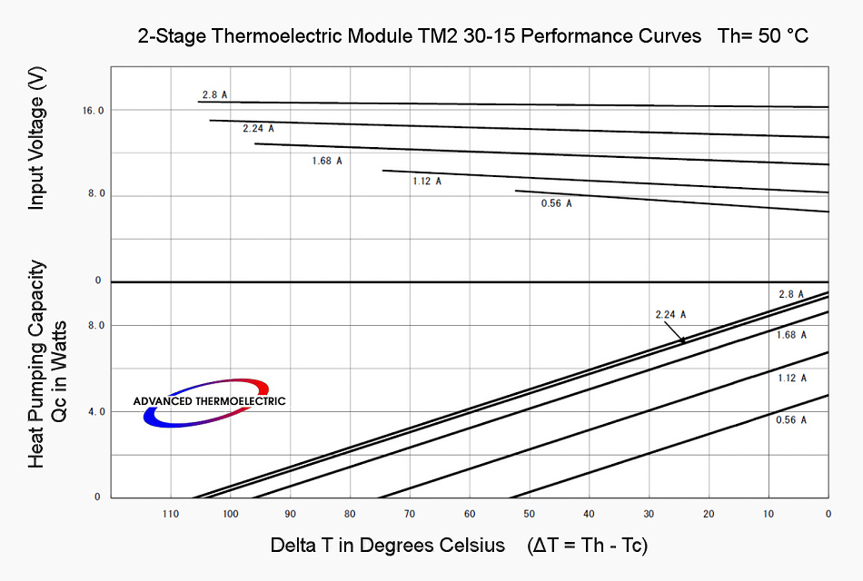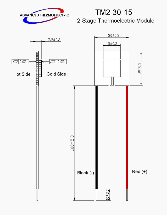 TM2 30-15-2.8 is a two-stage cascade style thermoelectric cooler with a ∆Tmax of 95 °C (∆Tmax 105 °C with Th of 50 °C). That's up to 25 °C more ∆T than is possible with a single-stage module. A larger ∆Tmax is desirable for cooling some sensors, detectors and devices that work best at temperatures lower than is possible with a single stage module.