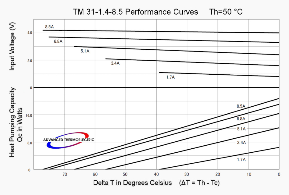 Curves with Th = 27 °C indicate what to expect operating in ambient temperatures around 20 °C (70 °F) with an operational "hot-side" temperature or Th about 7 °C above ambient.