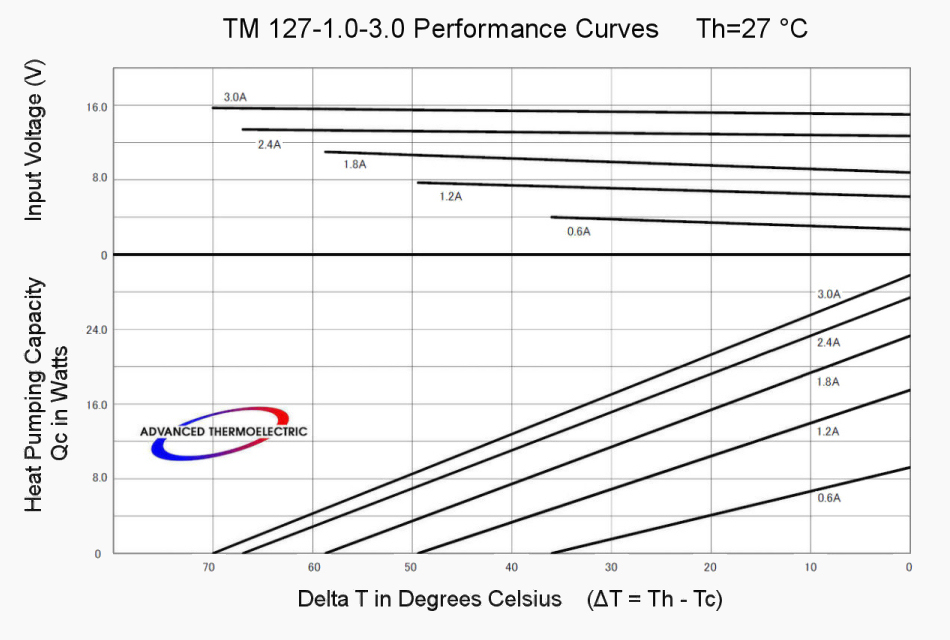 Curves with Th = 27 °C indicate what to expect operating in ambient temperatures around 20 °C (70 °F) with an operational "hot-side" temperature or Th about 7 °C above ambient.