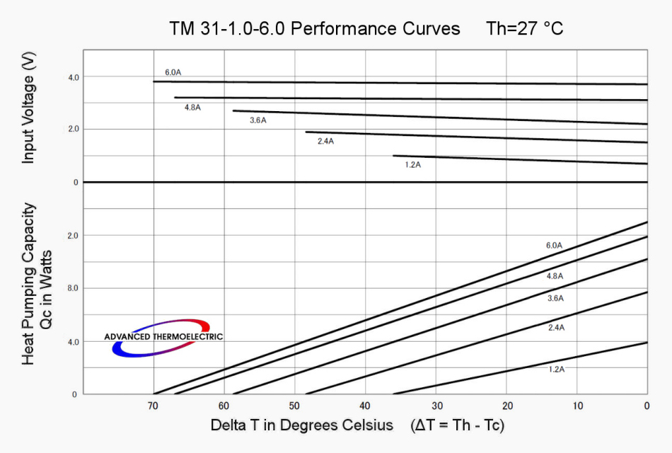Curves with Th = 27 °C indicate what to expect operating a well designed, fan cooled, assembly in ambient temperatures around 20 °C (70 °F) with an operational "hot-side" temperature or "Th" about 7 °C above ambient.