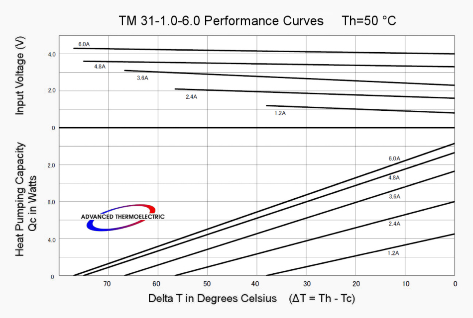 Curves with Th = 50 °C indicate performance expectations from assemblies with (relative) ambient temperatures in the 40-50 °C range. This includes assemblies with limited heat-sinking space yielding hot-side temperatures about 30 °C above ambient, marginally ventilated enclosures, outdoor, box-in-box, and other applications with warm temperatures around the hot-side of the TE assembly.