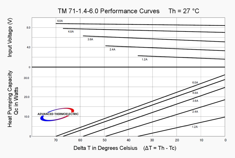 Curves with Th = 27 °C indicate what to expect operating in ambient temperatures around 20 °C (70 °F) with an operational "hot-side" temperature or Th about 7 °C above ambient.