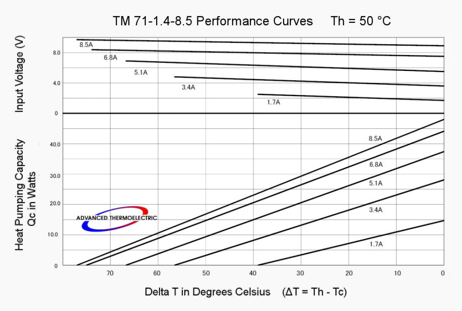 TM 71-1.4-8.5 is a popular multi-purpose single-stage thermoelectric module with a 30 x 30mm footprint. Typically used with 5 to 8 Volt DC power sources and with a robust 42 Watts of cooling capacity it’s powerful. Move more heat or shorten transient times... Frequently used in strings, when it's desirable to increase the temperature controlled surface area, when higher voltages are available. (2 @ 12V, 4 @ 24V, 8 @ 48V, etc.)
